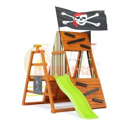 Для доступа к верхней части домика есть лестница-стремянка, а большой пиратский флаг с флагштоком создает атмосферу морских приключений и полет фантазии.